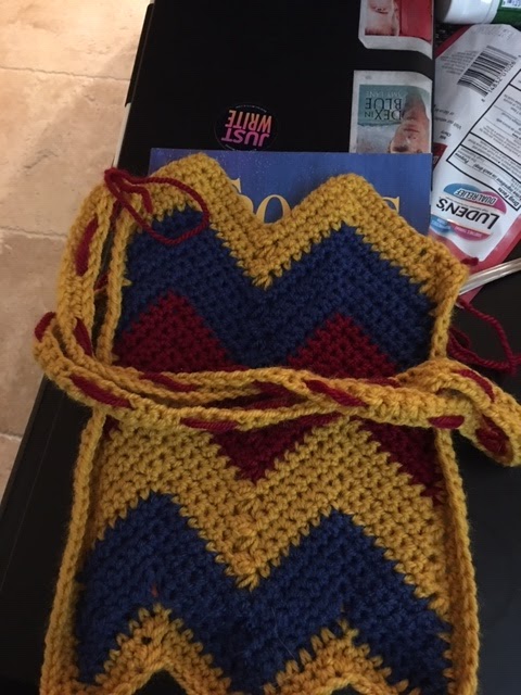 And then we came back here and I kept working on “essentials bags”. Now, I have four of them made, and I was going to stop at five and one for Squish. What they are is a bag just big enough for a cell phone and a wallet and keys– or a trade paperback, which is how I’m going to give them away at Cinema Craptastique. I sort of love the simplicity of these bags, and how three colors can be used in myriad ways for something unique and useful. I’ve left little slots in the straps to weave in earbuds–if audiobooks are your thing–and I’m pretty pleased.