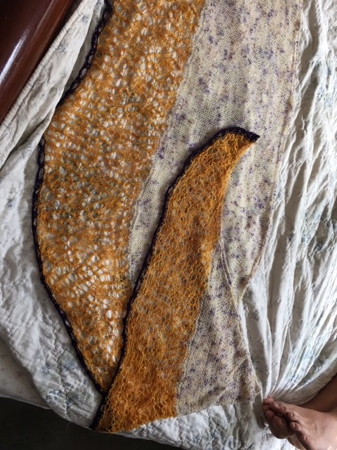 For those who don’t knit–I used needles too big for the pattern, so the lace pattern doesn’t look like a series of fountaining arches, it looks like a series of drunken spiderwebs. As Mate put it, the holes are too big.