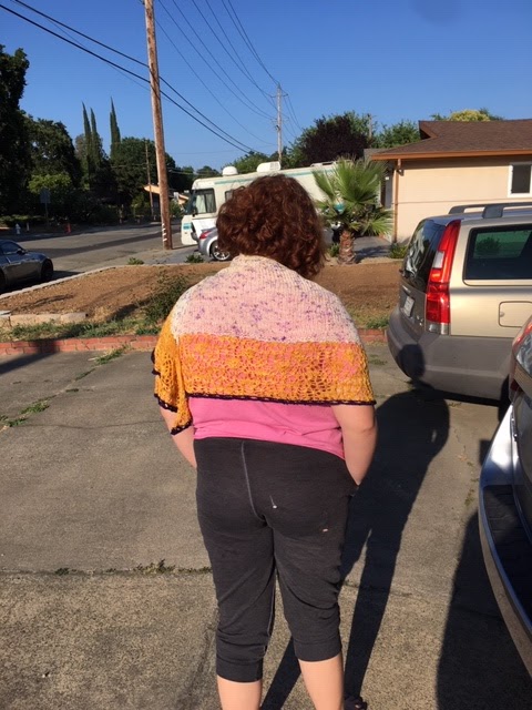 As a shawl, it’s serviceable, it’s pretty, and (as the kids noted) it’s in Amy Lane branded colors, so I’m taking it to NYC.