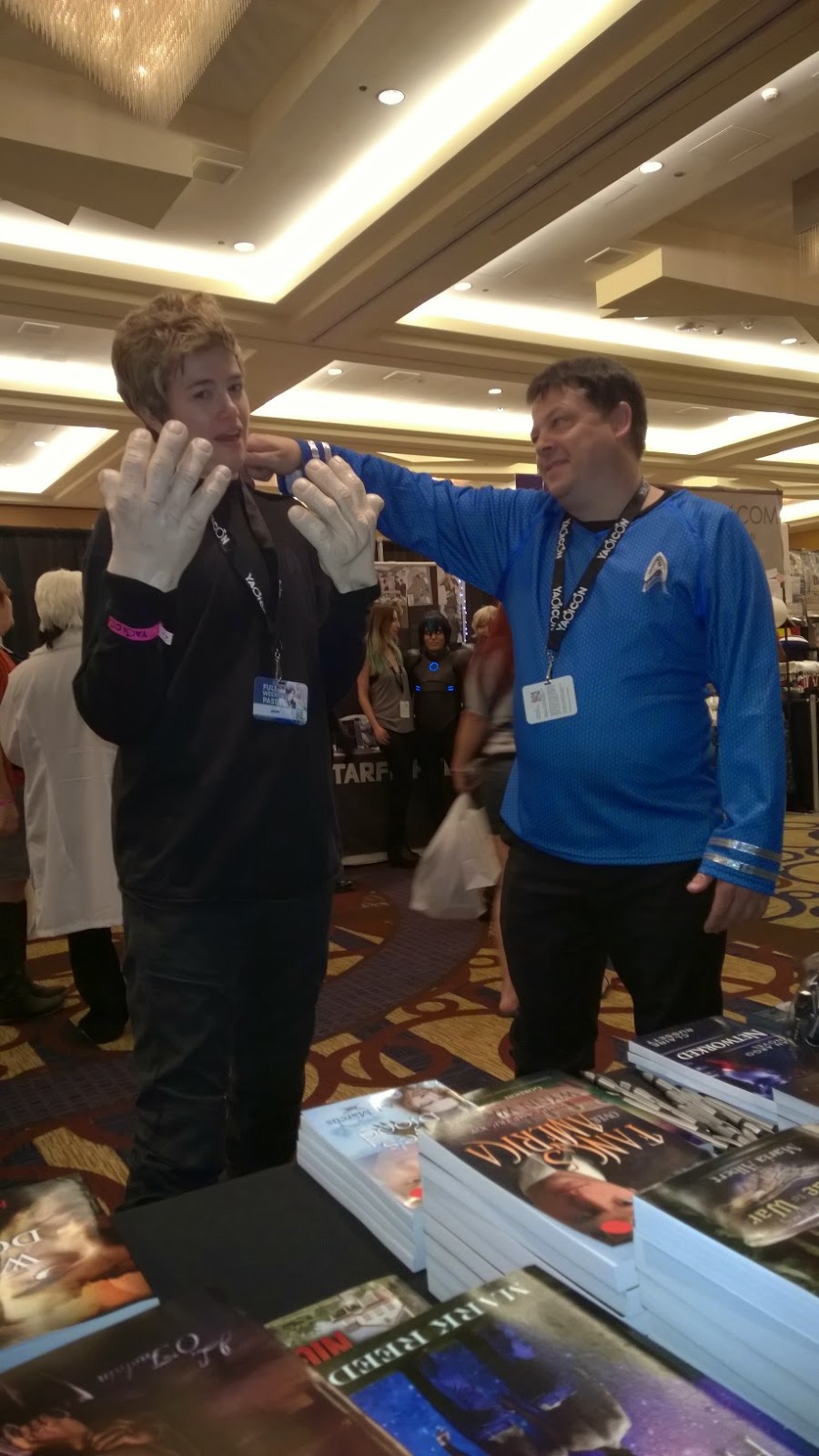 And into this wacky– and wondrous– mix of costumes and excitement and general consumeristic frenzy, there were actual fans of mine who came to see me. Roget, Erin, Laura, Jason–I’m talking to you. There were other folks as well, whose names I didn’t get, who told me they’d come especially to meet me, and that made me really proud. (The young woman who was depressed that we didn’t have a paperback copy of Truth in the Dark stands out particularly, as does @ctrl_issues whose name I didn’t get.)