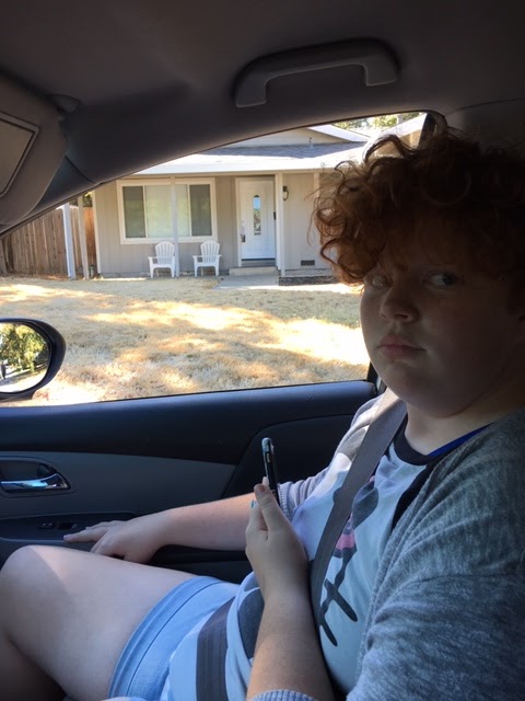 Squish and I always get to the spot where ZoomBoy comes to meet us about fifteen minutes early. I park in the shade, we turn off the car, open the windows, and chill. Today I caught a picture of her when she wasn’t expecting it.