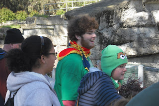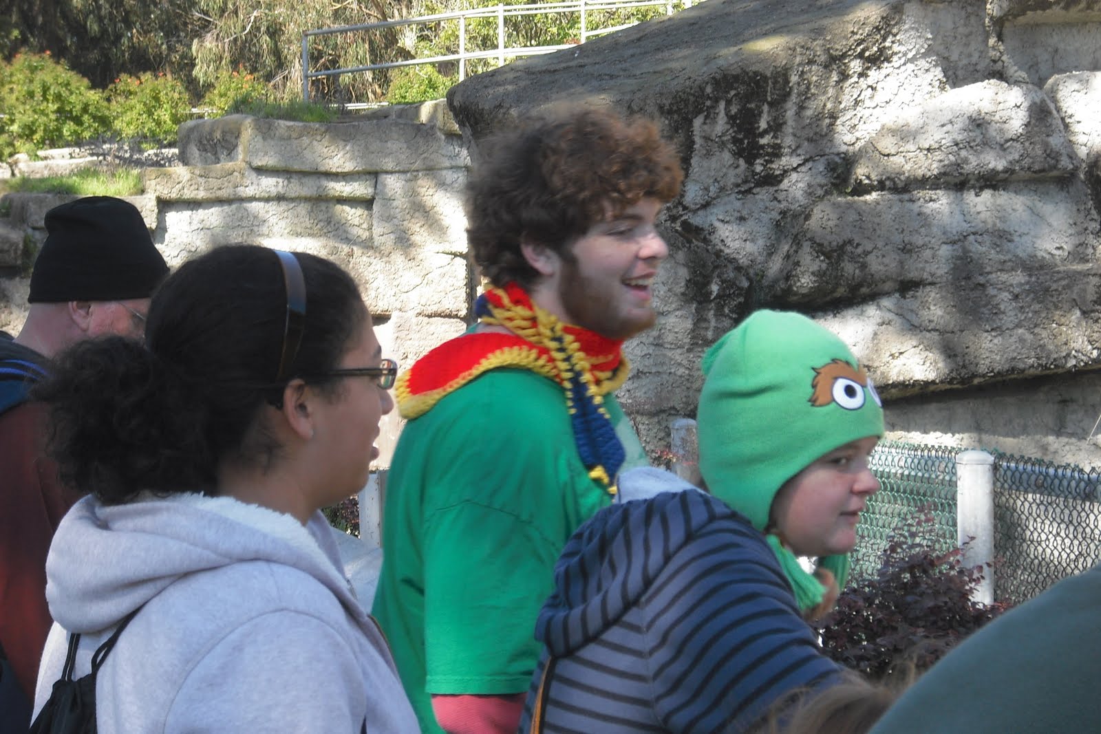 There is a good feeling at this zoo–(okay–not my feet, which are not happy in the best of times) — and there was a lot of laughter this day. Zoomboy, especially, enjoyed himself. Zoomboy is light and quick and can READ–he read EVERY informational plaque out loud to us, whether it was about the tiny Emperor Tamarind or the Blue Dyeing Frog. (He’s got a thing for poison frogs– they’re like his FAVORITE.) Squish was happy (although she got hungry and tired toward the end– four hours at the zoo is a long time) and Chicken had her friend to giggle with. Even Big T, who rarely accompanies us on family gatherings anymore (because he is old enough to stay home and play video games I guess) got into the spirit. He helped with the little kids and laughed with the rest of us–it was an impossible day to stay unhappy. There was just too much sunshine in the air.