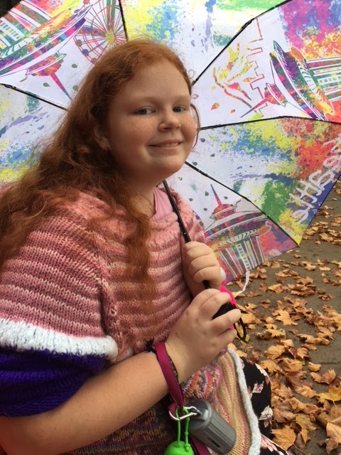 But that won’t change the fact that Squishy looks just lovely as we take a breath on the bench. She was so funny– it started raining as we left to walk the dogs and I asked if she wanted to wait. “No–because this way I get to use my new umbrella!”