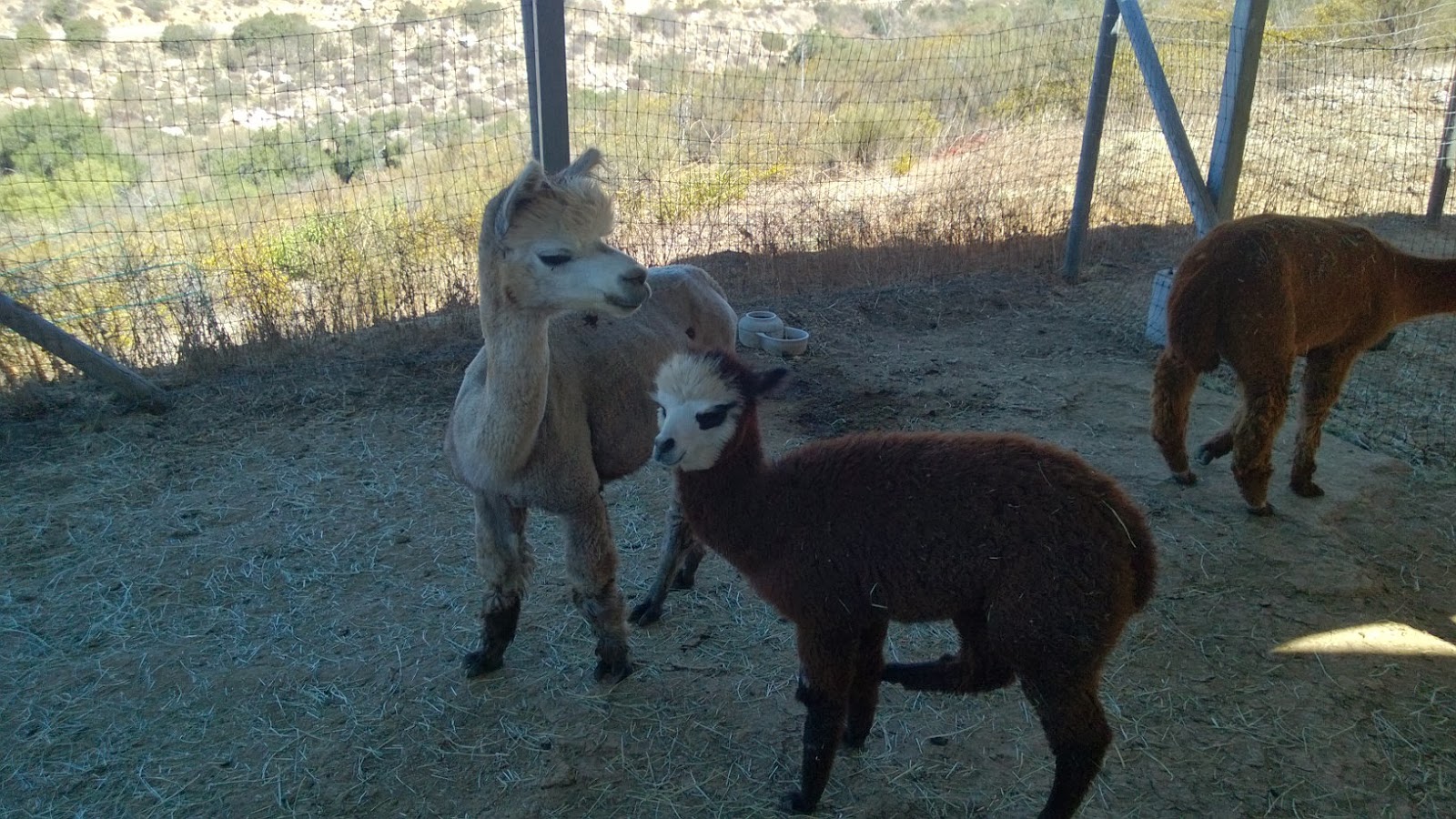 * We visited an alpaca farm in San Diego! Do you see the cria? Isn’t he adorable? The guy with his head cut off in the picture was a crack up– he was such a little piggy. He wandered around the pen whining “hyum… hyun… hyun…” until we fed him some hay just to make him feel better. I got a two teddy bears there for Squish and Chicken. Squish’s is just cool– all brown alpaca, including nappy curly fur on his ass. Chicken’s has a treasure trail. See that picture? She’s embarrassed– she begged for that bear!
