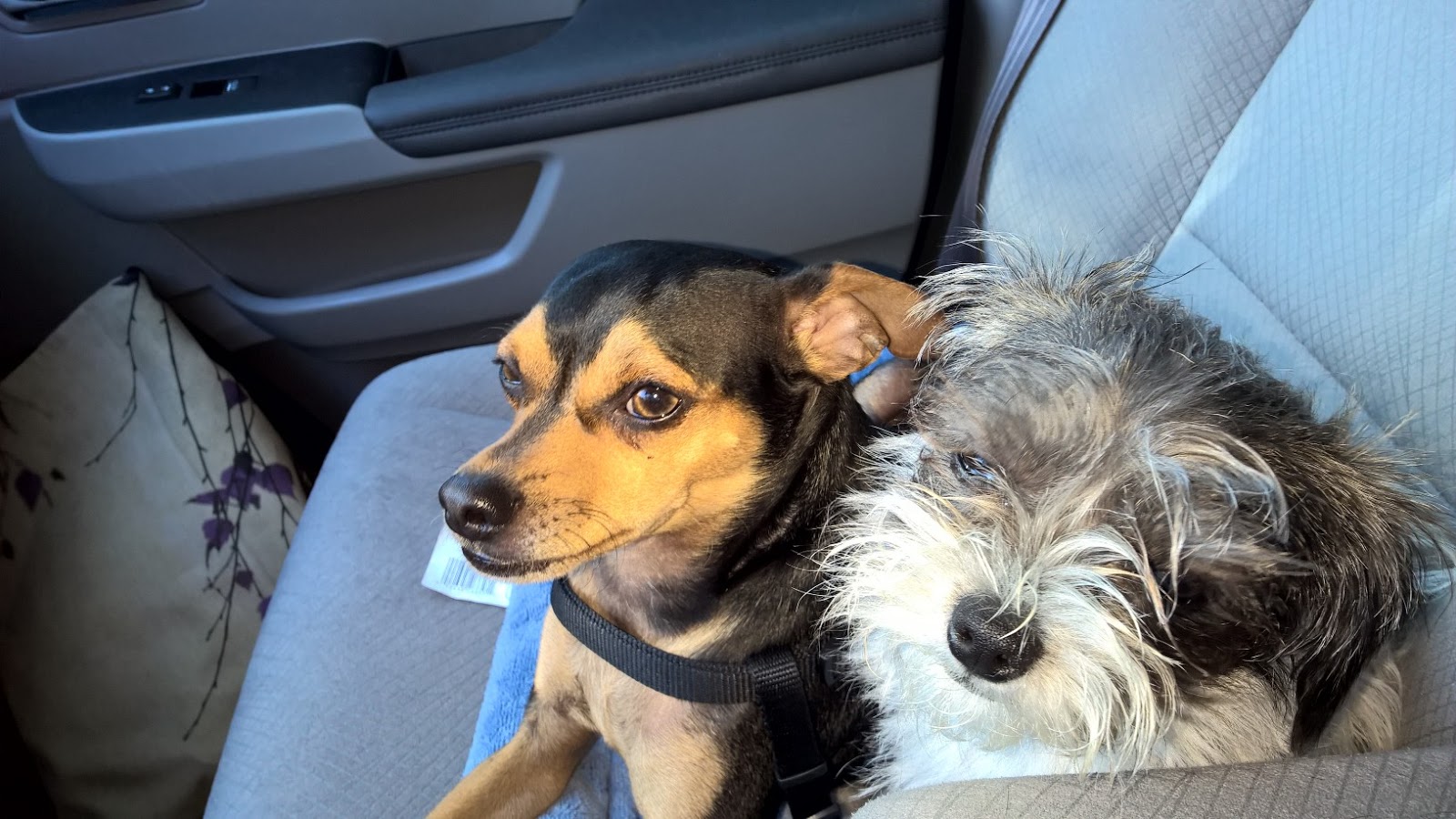 Geoffie was going batshit by this time, so the clerk helped me put the halter on so she could walk too, like Johnny. And this is how stupid I am. I thought it was so she could actually walk like Johnny. so when they both stopped to dig in the planter, I pulled them both out, because who needs to worry about Dogzilla pee when you’re in a shitty parking lot next to a really busy street? So I pull them into the car, and Geoffie starts whining and then…