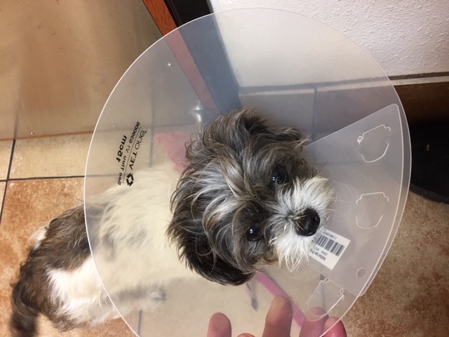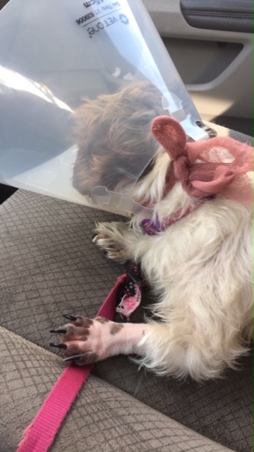 It started out as a boo-boo, and then she chewed on it and it became an ouchie, and today she was three-legging it around the park and now she has a cone of shame and a goblin paw.