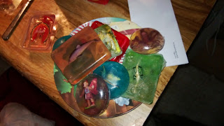* Chicken has made clear glycerin soap with little tiny plastic animals in the middle, like sort of the prize for using all the soap. The results make us giggle, and she agrees they’re an awesome gift for her friends. My idea. Uh-huh. We have it here in writing.