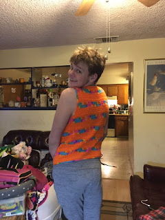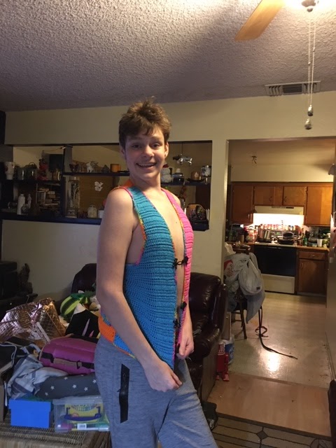 * ZoomBoy found this vest. I made it for Squish — in fact I made a couple of them, not just for her–when she was around seven years old. It’s a little old and a little stretched out now, but the colors are in his wheelhouse and… well, let’s just say he had an entirely different vision of this vest than how I’d pictured it when I made it for a chubby little girl.