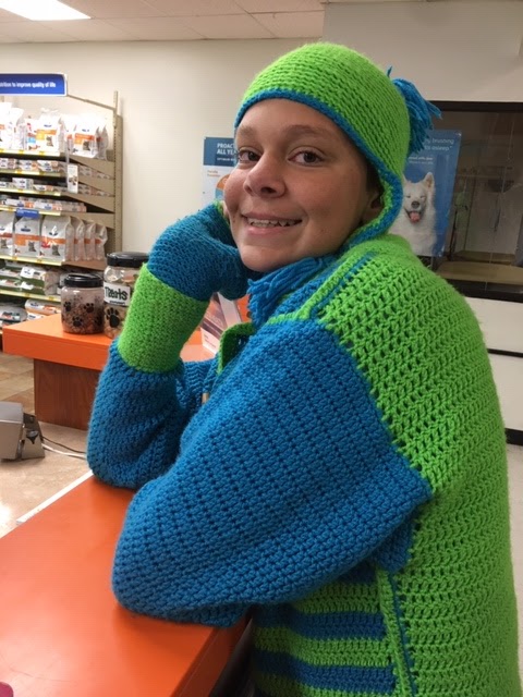 Squish is getting entirely too old and sensible for Mom-wear, but ZoomBoy still treasures his sweater and the hat and mitt (yes, one, we don’t know where the other one is) that go with it.