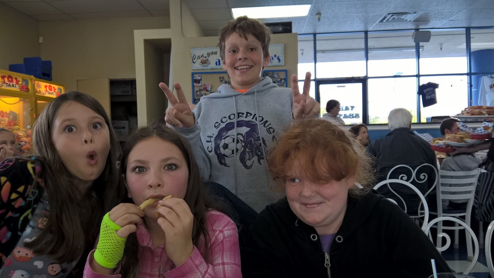 Okay, so the kids made the birthday party at Leatherby’s– but Mate had to drop them off while I got the present. (I missed the after party, where there would be horror movies and gossip with my friend Berry Jello… *sigh*) Afterwards we took the kids to my parents, met Wendy and Chris for dinner, saw SPECTRE, got the kids and came home.