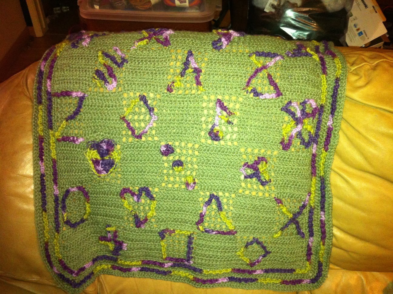 So, one of those little motifs is a rattle. I swear. When the blanket is right side up, it looks like a rattle.