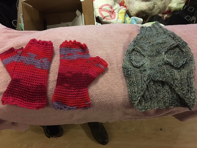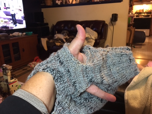 The GIF set isn’t the only thing I made– I also finished a knitted dog sweater and a pair of fingerless mitts, crochet style. Now, originally I was going to put dragon scales on the backs of these–and we’ll see. I still might do it. I’m just afraid I won’t have enough yarn to scale both mitts, and it’s sort of a singular ball, so that would be unfortunate.