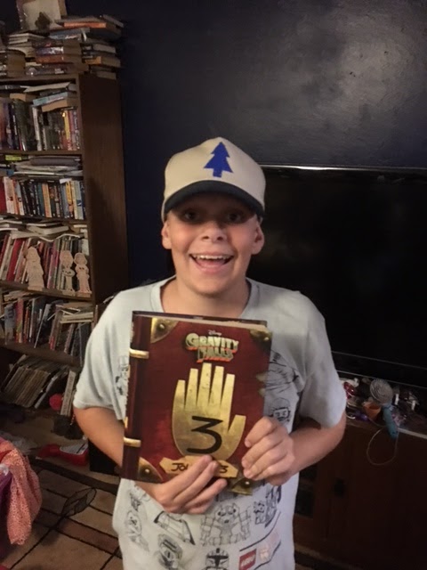 Tonight he opened his present from his big sister–it was the journal from Gravity Falls. As soon as he saw it he went and fetched his Dipper Hat, so he could read the journal in the appropriate frame of mind.