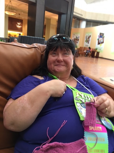 Or, “Oh yeah– Karen and I copped a knit– that was fun. I also knit during a couple of panels, but I did not, alas, finish Lynn’s fingerless mitts.”