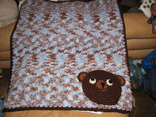 And the applique– done in Red Heart Soft, dk brown, lite brown, aran, & black