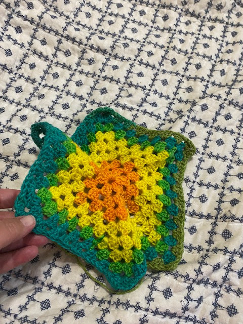 And that may not seem like a lot–I mean, look at it. It’s tiny. But imagine you made one of those and went around and around and around with some slightly thicker yarn… you would have a GINORMOUS granny hexagon.