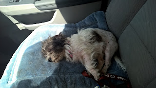 * While the kids were gone, the dogs spent their time barking outside at the workmen next door. When it came time to go pick up the kids, only the small dog elected to go. This is her, asleep in the car. No, people, she’s not dead.
