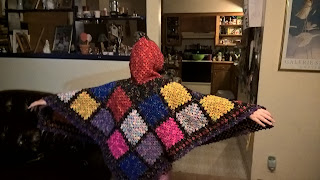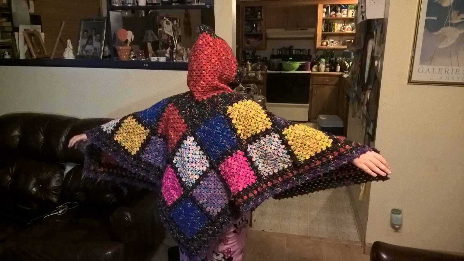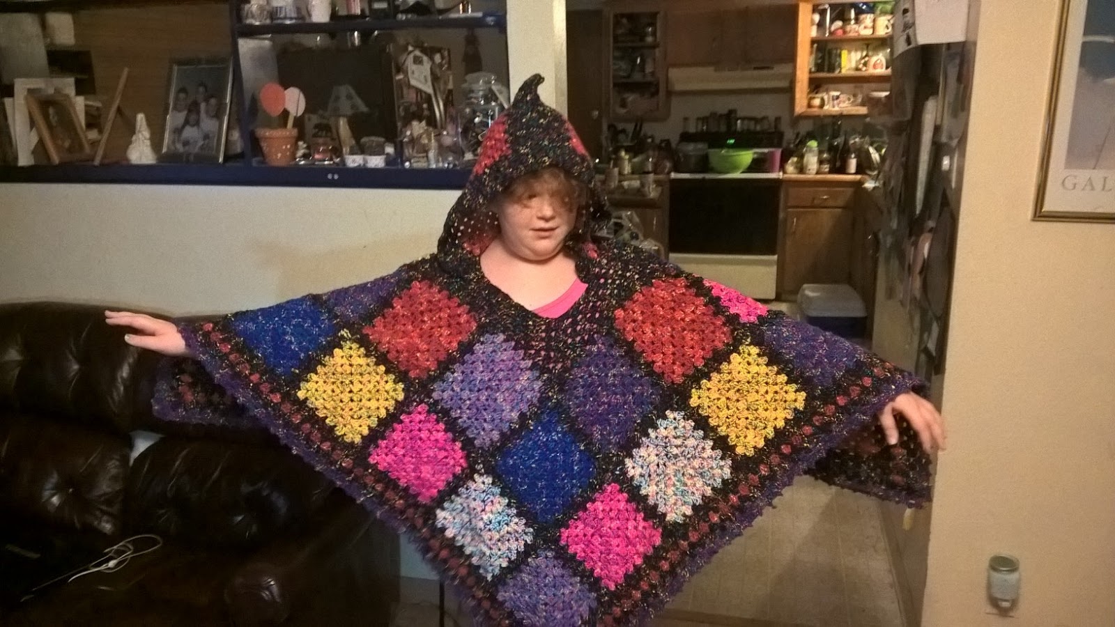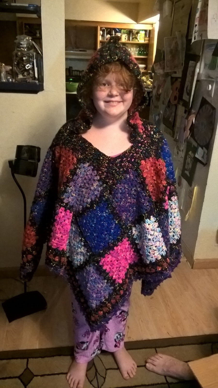 This poncho is made of worsted weight yarn–that’s a 4 in thickness on a scale of 0-6, so it’s sort of your average thick yarn. (These people live where it gets cold–seriously.) It is of medium difficulty–I used a couple of expert’s tricks to make it go faster, and I did something whip-spiffy on the bottom edging, because they didn’t want fringe, and it just needed that extra something. I designed it myself, using knowledge accrued of over 18 years teaching myself to knit and crochet, studying patterns and while not making everything I loved, figuring out how to make it if I wanted to. If I’d used a finer yarn, or a more difficult square, I could have increased the difficulty–and the time to finish–by about 250%. I didn’t want to do this–I wanted her to have it for the fall, when it starts to get cold.