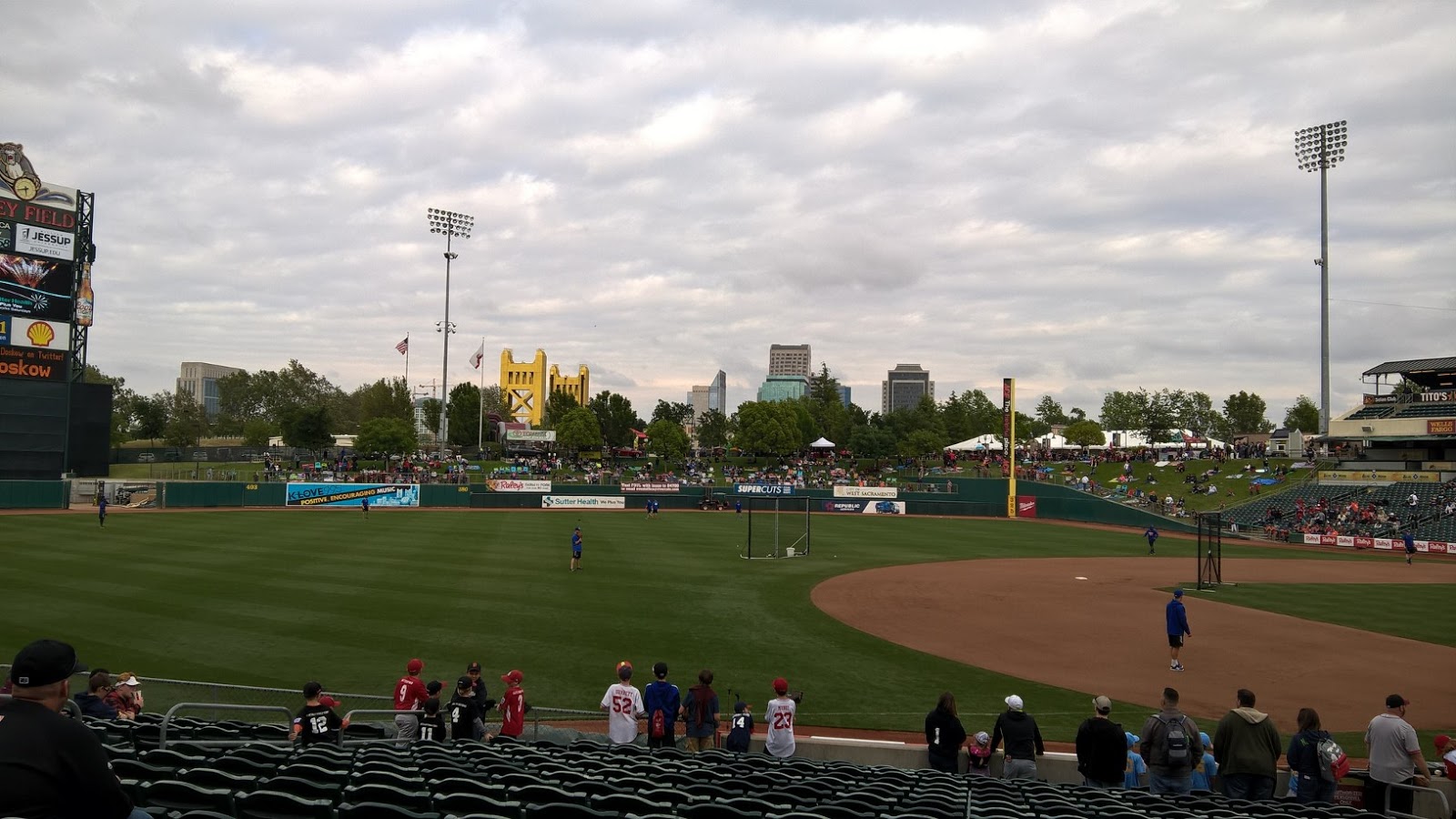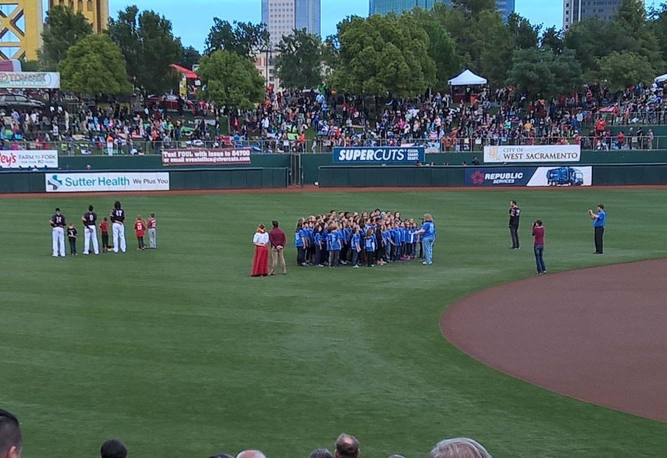 So, Squish got to sing at the RiverCats game tonight–her school’s choir/band got to perform the National Anthem.