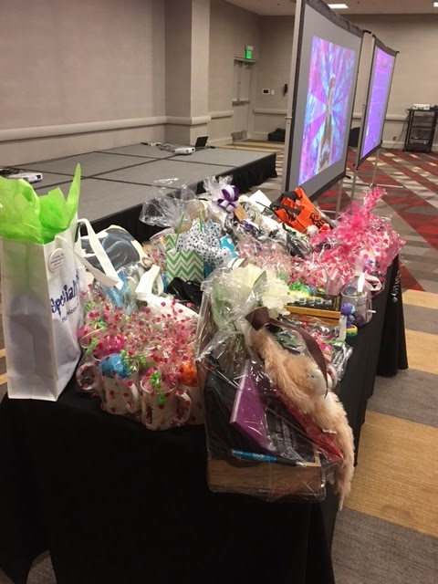 This is the prize table for Cinema Craptastique last night–a LOT of amazing authors gave some great stuff, and we had the most fun giving it away while talking shit about the movie Glitter. |
