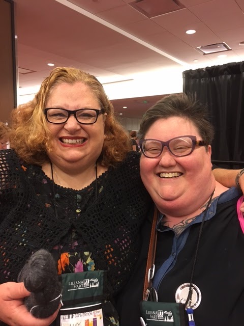 This is Emiliana, and see, here’s the thing. I was in line for the Rockabilly event, and we were talking and I hadn’t brought any yarn or projects, which, I know, is unheard of. Anyway–she’d brought that for me too. It’s silk and alpaca and the color of a mermaid’s scales, and so even when I don’t bring yarn, I get yarn. And this awesome picture with a lovely reader who gave me some awesome yarn. |