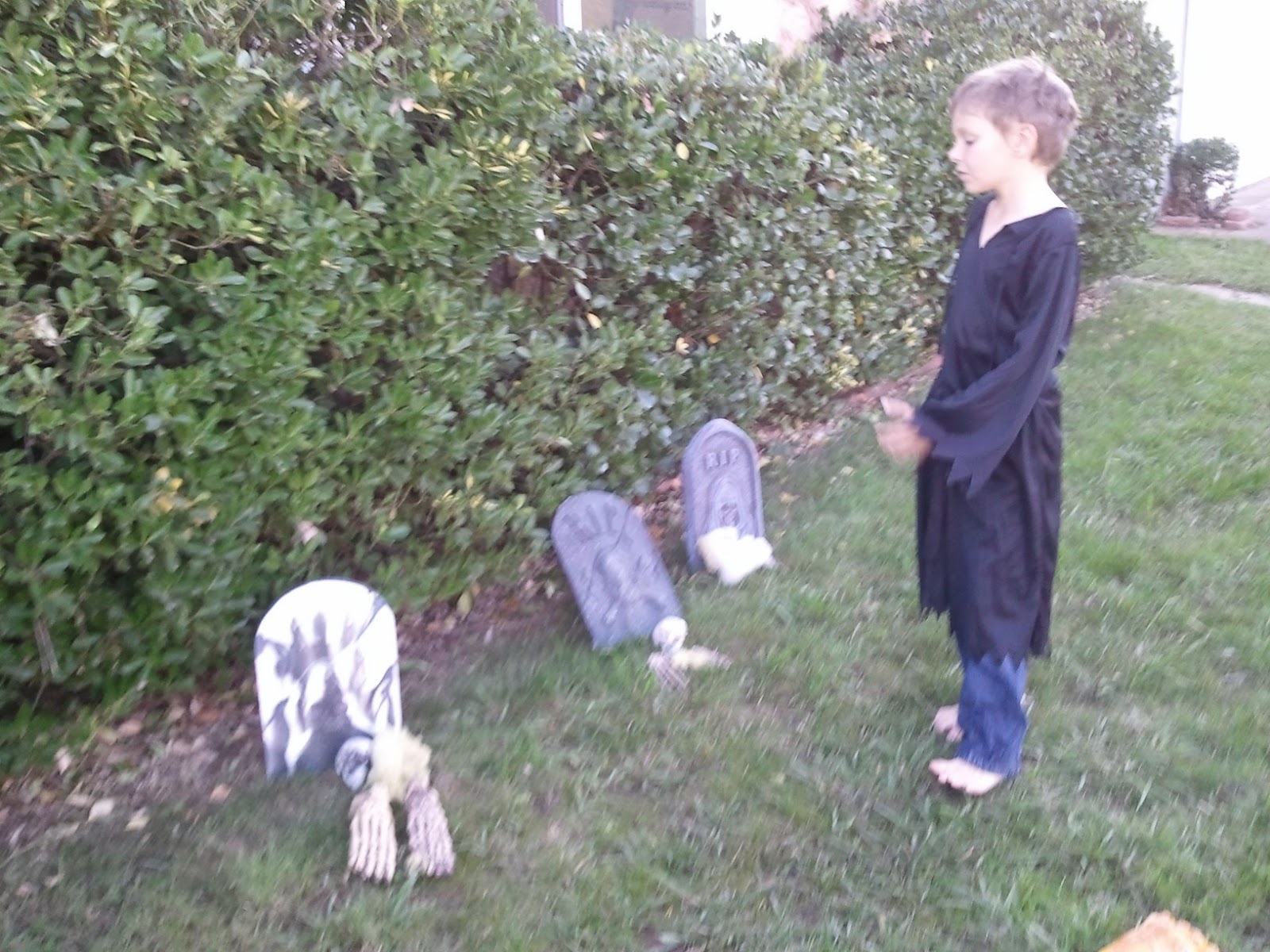 Her friend came over, and they gave out candy while Mate and I took the short people out on their annual Halloween death march, so called because although our neighborhood isn’t very long and we by no means covered all of it, they were, of course, whining us to death by the time we were done canvassing for sweets.  It was okay–we had a couple of scary houses (one of which sent Squish squealing down the walk shrieking “Too scary!  Too scary!  I’m too young!  I can’t go there!”) and some pretty pretty decorations which Squish was very apt to comment on, to the great delight of those being voluntarily mugged for sugar.  Zoomboy was dressed as the Grim Reaper– he tried to get away with just gesturing with his scythe, but eventually he realized that went against his basic politeness and unbent enough to wish people a happy Halloween, and to thank them. Squish had no such prohibitions built into her costume. None at all.