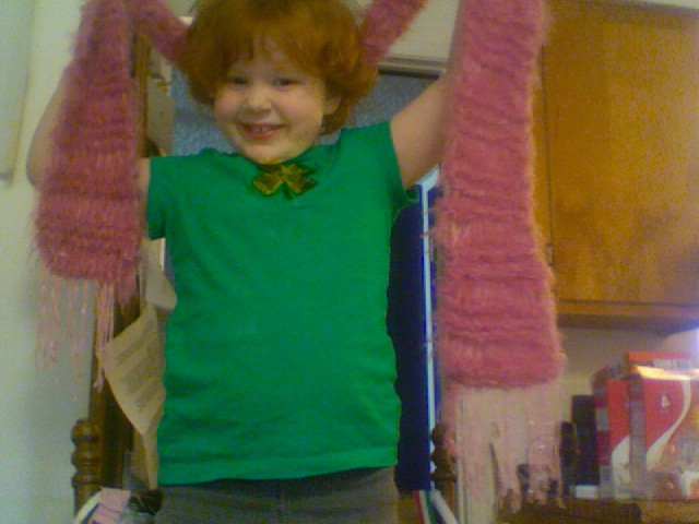 And that’s why I led with my kid showing off scarves. The first one is in her two favorite colors–pink furry and pink shiny, and the second one is for Littlewitch, who asked for something in vampire blood with maybe some black, and now she will maybe stop pasting “Write bitch!” on my Facebook, because, you know, knitting is good on her end too!
