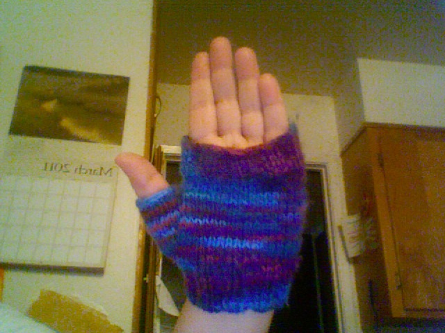 –Am working on another pair of fingerless mitts. I’ve got sort of a basic pattern here for worsted yarn and really small needles that I like, because they feel sturdy and solid. The pair I’ve shown here is using heavy worsted (not quite chunky) and slightly larger needles–I have large hands, they fit fine, but for normal people, I suggest a regular worsted weight and the size 4 or 5 dpns. I’m posting the pattern right here, in case anyone wants it: