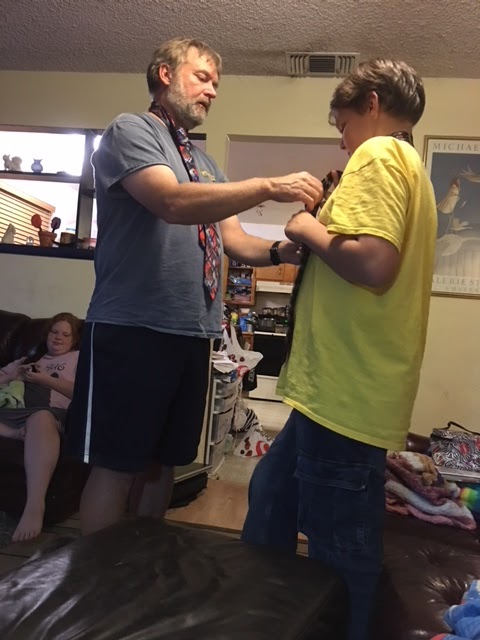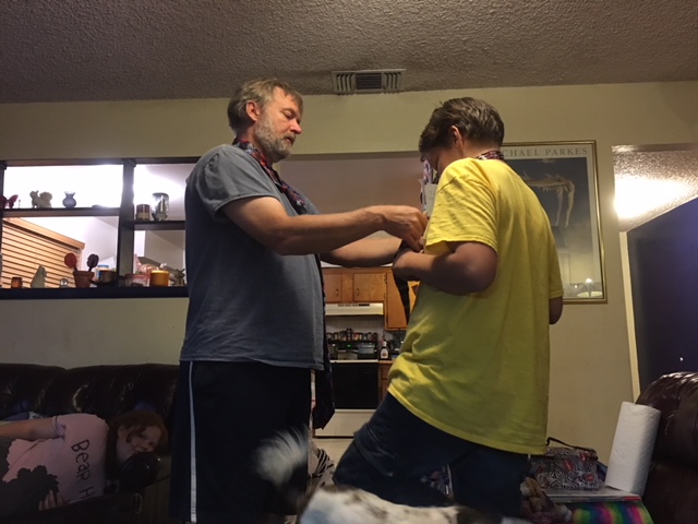 But last night he came home asking for help with his makeup–which his sister promptly gave him, no moms allowed–and help with tying a tie.