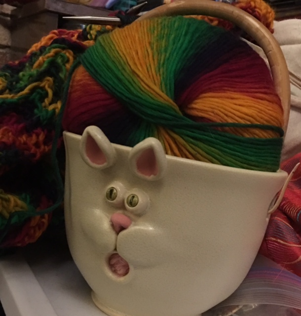 From Karen, I got a yarn bowl! I haven’t started a new project yet, so it’s not quite appropriately used, but I can’t wait until I start the sweater I’m planning for Chicken, and I can put the yarn through the bunny’s mouth and GO!!!! I love this yarn bowl– it has been my knitting companion for a week, and it will keep me sane for many projects to come!