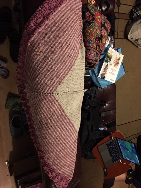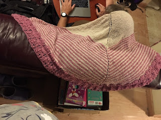 So this is the first–I’ve started three others. It’s the Oaklet shawl and the designer was nice enough to offer it as a free download on Ravelry. If you’re looking for a way to ease into lace, this is a good one. It’s worked from the top down so you really just have to master the YO first, and then, when you’re good and comfortable, there’s a very basic lace pattern that repeats for about eight rows, and then a slightly more complicated one that it finishes off with. Seriously– it’s like it was written as a training project, and it’s pretty awesome.