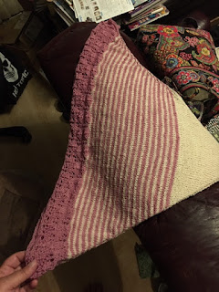 Anyway– the stripes were my idea because I got that far with just the ecru and went, “Hello, this is driving me batshit insane.” Oddly enough, switching colors every two rows helped keep that down.