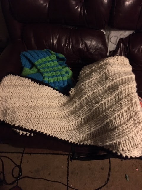 He laughed and I said, “It should be done tonight–maybe you bring it in tomorrow and say ‘My mom can make you a sweater but it will be a while. Maybe this can keep you warm while you wait.'”
