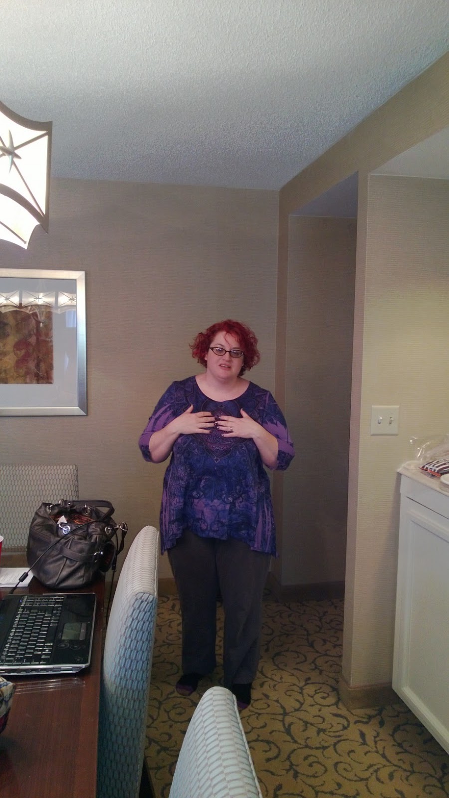 And then, hopefully a trip to get my nails fixed (oi! Long story. Accidental acrylic tips that I finally just clipped off in pique–I swear, they slowed my writing down in immeasurable ways.) And maybe, if I’m really good, a trip shopping. I hate packing. Especially for these trips. There is a whole “change for dinner” thing. I woke up this morning, put on knit shorts, a holey T-shirt (and not the blessed kind), and a sweater with holes and a Chiwhowhat in the bosom. If I decide not to shower (always a possibility when you don’t see real people all day long) I may wear this outfit to bed. At conventions and conferences? I have to pick not just one, but two outfits for any given day that do not make me look like a fat housewife doing laundry. Can you hear me whine about the injustice? *whine*