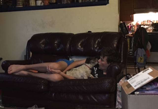 Mate, he brought food–Adalberto’s carne asada burritos are the best, but they’re pretty big, and they’re all meat. I cut mine in half to save part for tomorrow, and went to microwave some brussels sprouts to offset all that meat. Of course, we started talking about the dog and her stench-o-rama and as we did so, ZoomBoy laid on the couch and pet her and she clambered all over his body and then made herself comfy in the “gas chamber”– that spot that forms right under your ass and behind your knees.