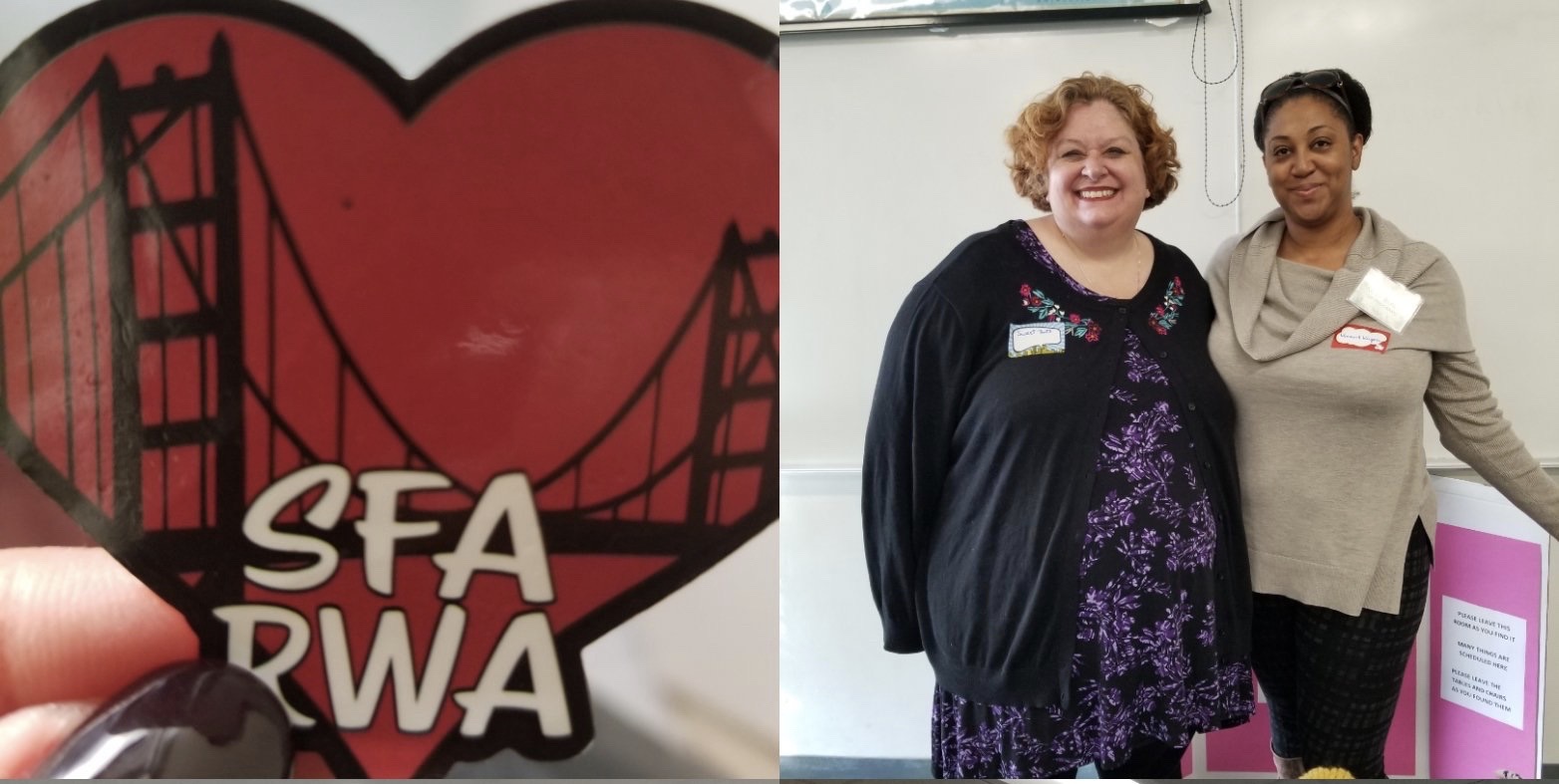But teaching at the East Bay chapter of RWA was a blast! Lovely, lovely authors–all of them kind and accepting, and I felt right at home. Their usual room was hijacked by somebody (there was much grrrrrrrr about this–heads will roll!) and we had a smaller classroom and it was packed to the gils. (See the chapter’s promo picture of me with Kilby Blades, who, bless her, was the one who asked me to speak <3 nbsp="" p="">