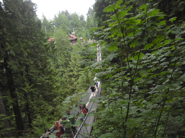 Okay… this is a little harder. Mate was actually WORKING during this trip–he was at siggraph, which is a conference of engineers and artists, built around how graphics programs can better work to entertain the hell out of us. I went on Tuesday (more about that later) but on Wednesday, I didn’t want to mooch around the hotel room anymore, (because one day was bliss, but two days would have been boring) and so I caught a tour bus to Grouse Mountain. One of the stops up the mountain was here–it was sort of a walkabout attraction. You could go on the suspension bridge, the cliff walk, the treetop walk or just generally ramble. This is the suspension bridge, and it’s sort of cool. It wasn’t that far up (for me, anyway–I’m used to going over the Forresthill Bridge, which is around 800 feet up–this one was 250 feet up) but that didn’t keep me from cold sweating and freaking out as I crossed it. Both ways. But still– wasn’t going to take the tour to say I wussied out at the last minute, was I?